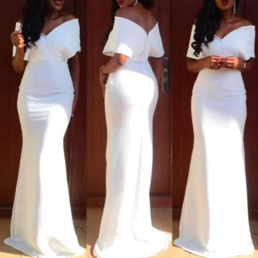 Fashion V Neck Off The Shoulder Short Sleeves White Cotton Blend Mermaid Floor Length Women Dress